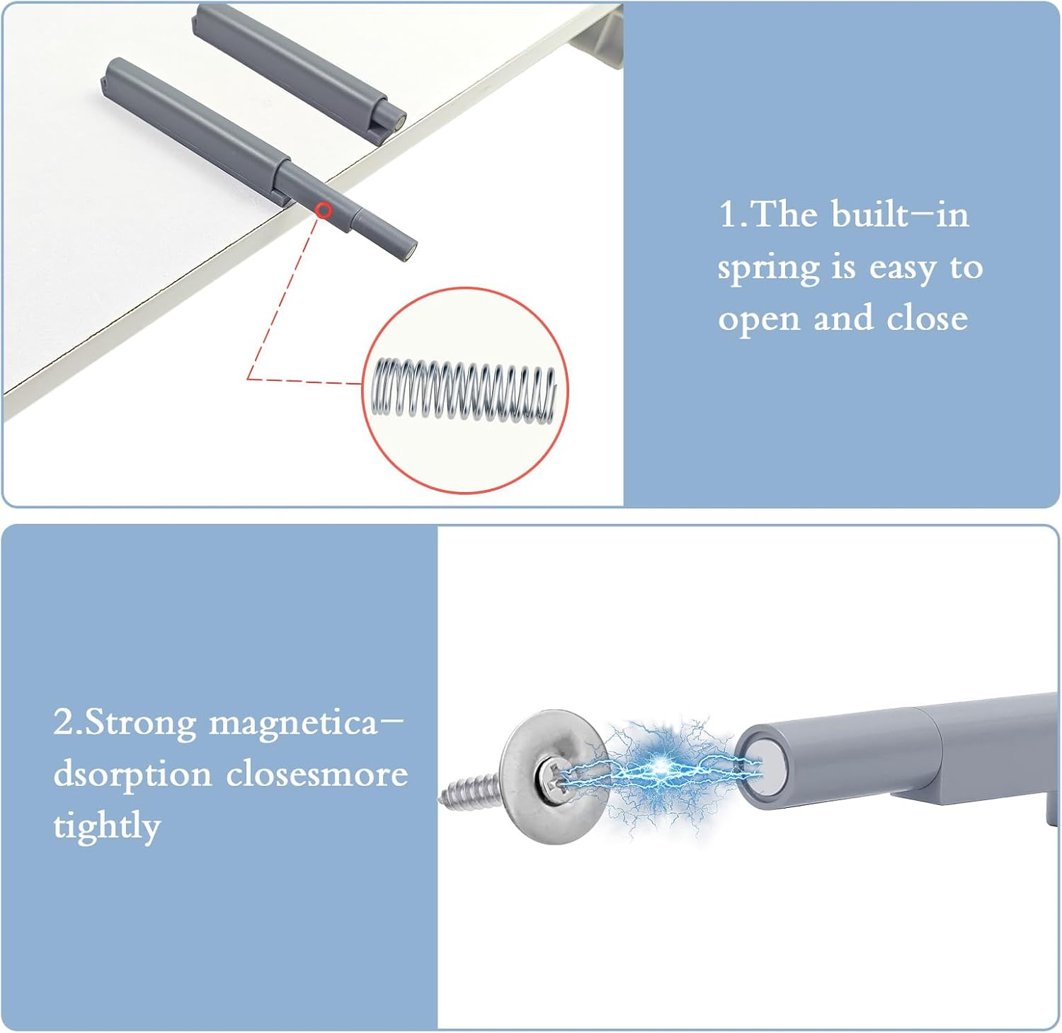 【EASY TO OPEN AND REDUCE NOISE】Damper latch with screws is easy to use,no need to install a handle, just press the cabinet door,the spring will lift or contract easily, you can quickly open or close the cabinet door, you can free your hands.And the noise is very small, Magnetic Door Push which can provide you a quiet and comfortable environment.