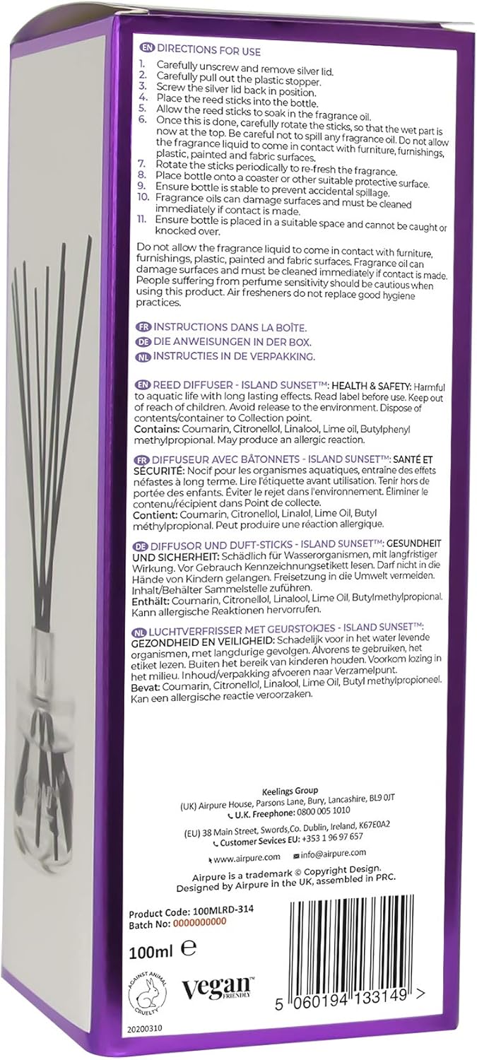 AIRPURE Reed Diffuser, 100ml Oil Set with Sticks, 8X Black Reeds, Continuous Room Scent, Diffusers for Home Use in Living Room, Kitchen or As Bathroom Freshener – Island Sunset Fragrance, 100MLRD-314