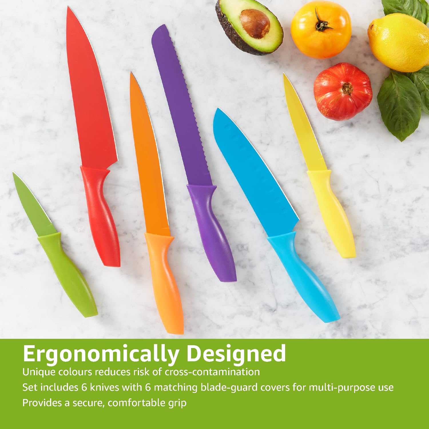 Novice and experienced chefs alike will appreciate this convenient AmazonBasics 12-piece coloured knife set. The professional-quality knives come in a range of stylish colours and feature durable stainless-steel blades that resist staining and effectively hold a sharp cutting edge for safe, efficient use. The set includes six knives with six matching blade-guard covers. The knives include a paring knife, a utility knife, a Santoku knife, a carving knife, a chef’s knife, and a serrated bread knife.
