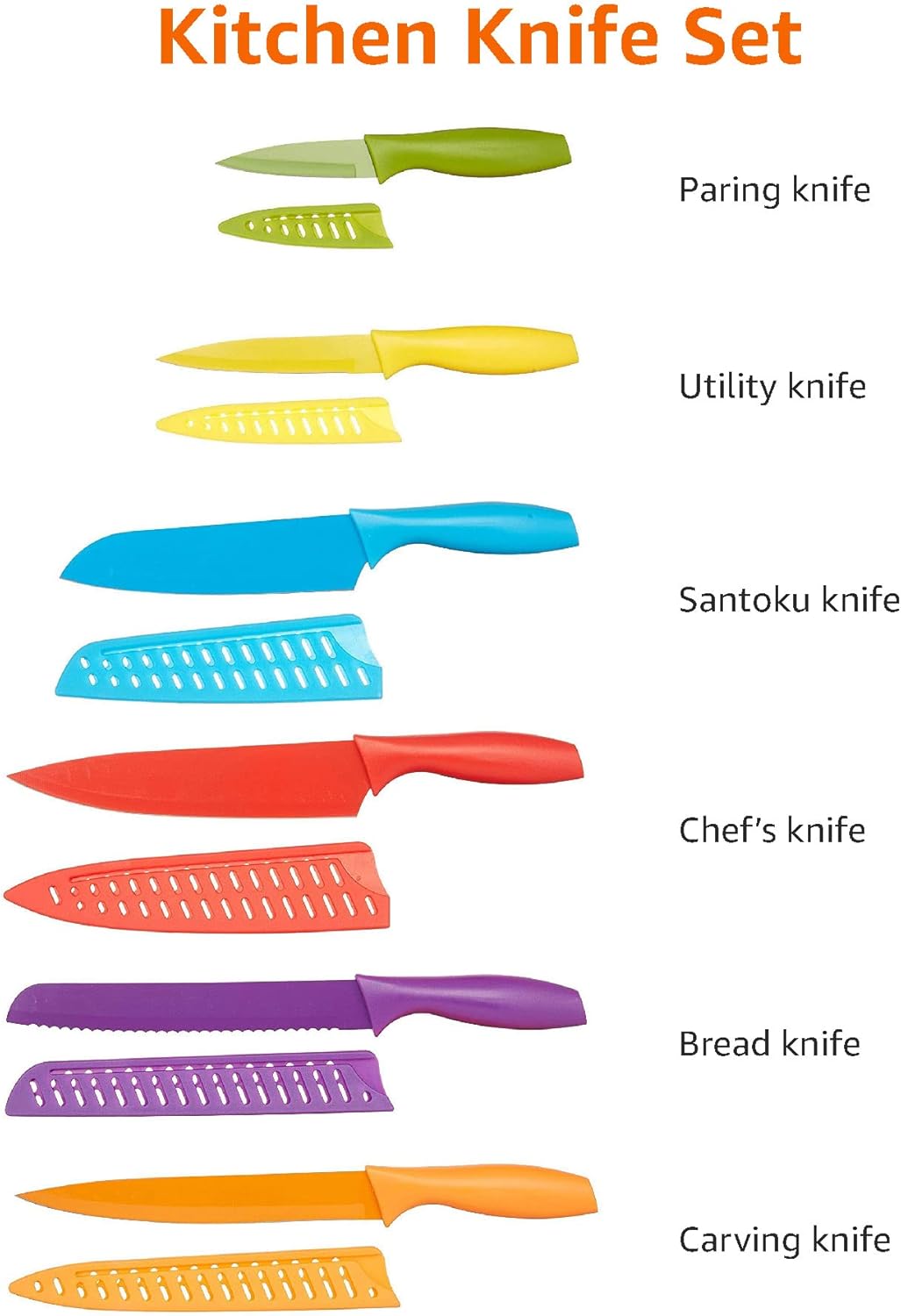 12-piece coloured knife set includes 6 knives and 6 matching knife covers; Knives include: paring knife, utility knife, Santoku knife, carving knife, chef’s knife, and bread knife