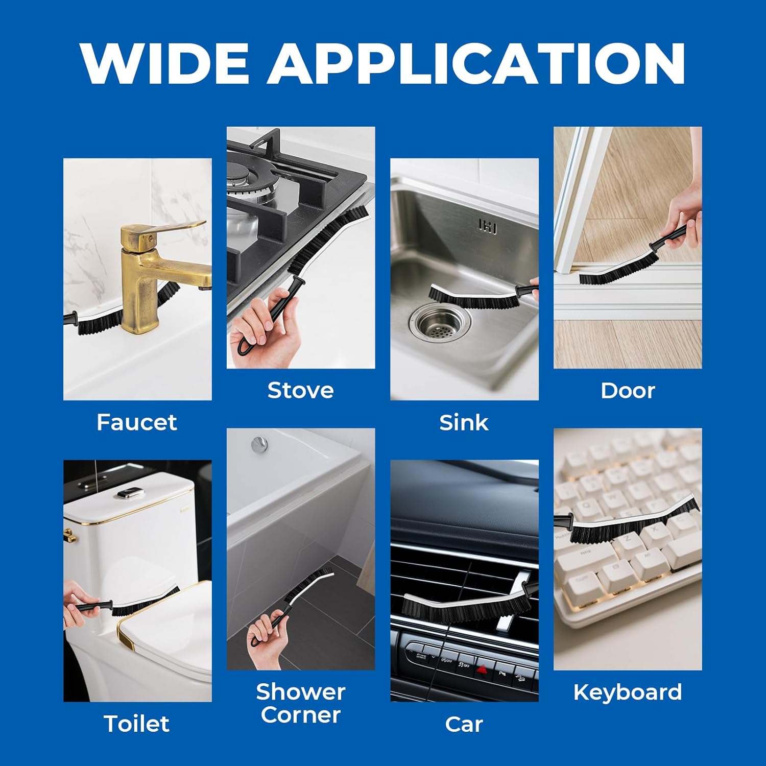 Multi-purpose Brush: Our cleaning brush is suitable for cleaning various surfaces such as sinks, window tracks, blinds, door tracks, faucets, cars, stoves, grout lines, basins, floors, keyboards, bathtubs, vents, drains, swimming pools, vehicles, furniture, boats, countertops, microwaves, coffee machines, shower door frames, fans, shoes, sneakers, ovens, washing machines, toilet tank floors, the seam between the toilet bottom and toilet lid, the gaps in carved furniture, outdoor brick seams, etc.