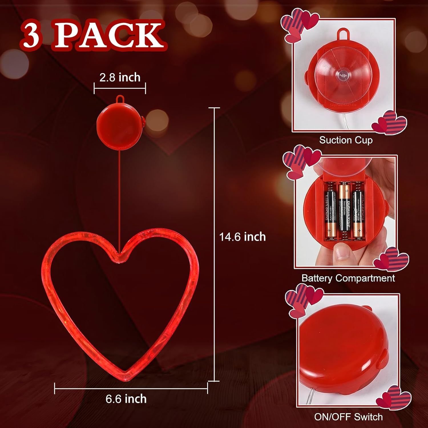 VALENTINE’S DAY DECOR: You will get 3 packs of red Valentine’s Day LED hanging window lights in the shape of 3 hearts that come with suction cups. The big heart ornament diameter is 6.5 inches, the “→love→” diameter is 8.5 inches, and the string drops 14.6 inches. Our romantic window lights are ideal for Valentine’s Day decor.