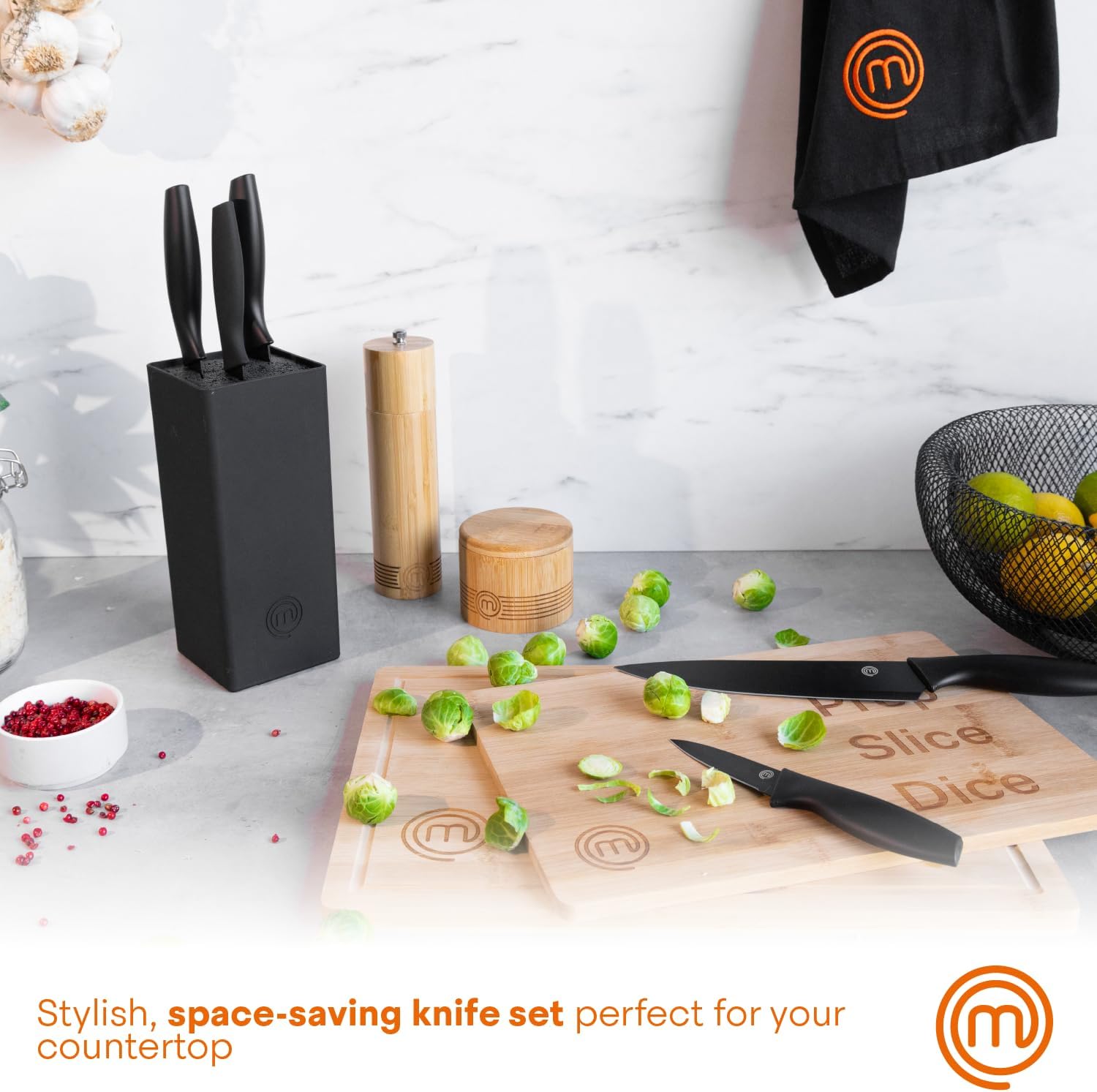 This MasterChef official, hand-sharpened, stainless steel kitchen knife set contains a knife for every eventuality. Whether it be for salad, bread or herb cuttings, this sleek black knife collection has you covered for any meal or occasion. Comprised of 5 expertly constructed pieces, each knife is embossed with the official MasterChef logo on the body of the blade.