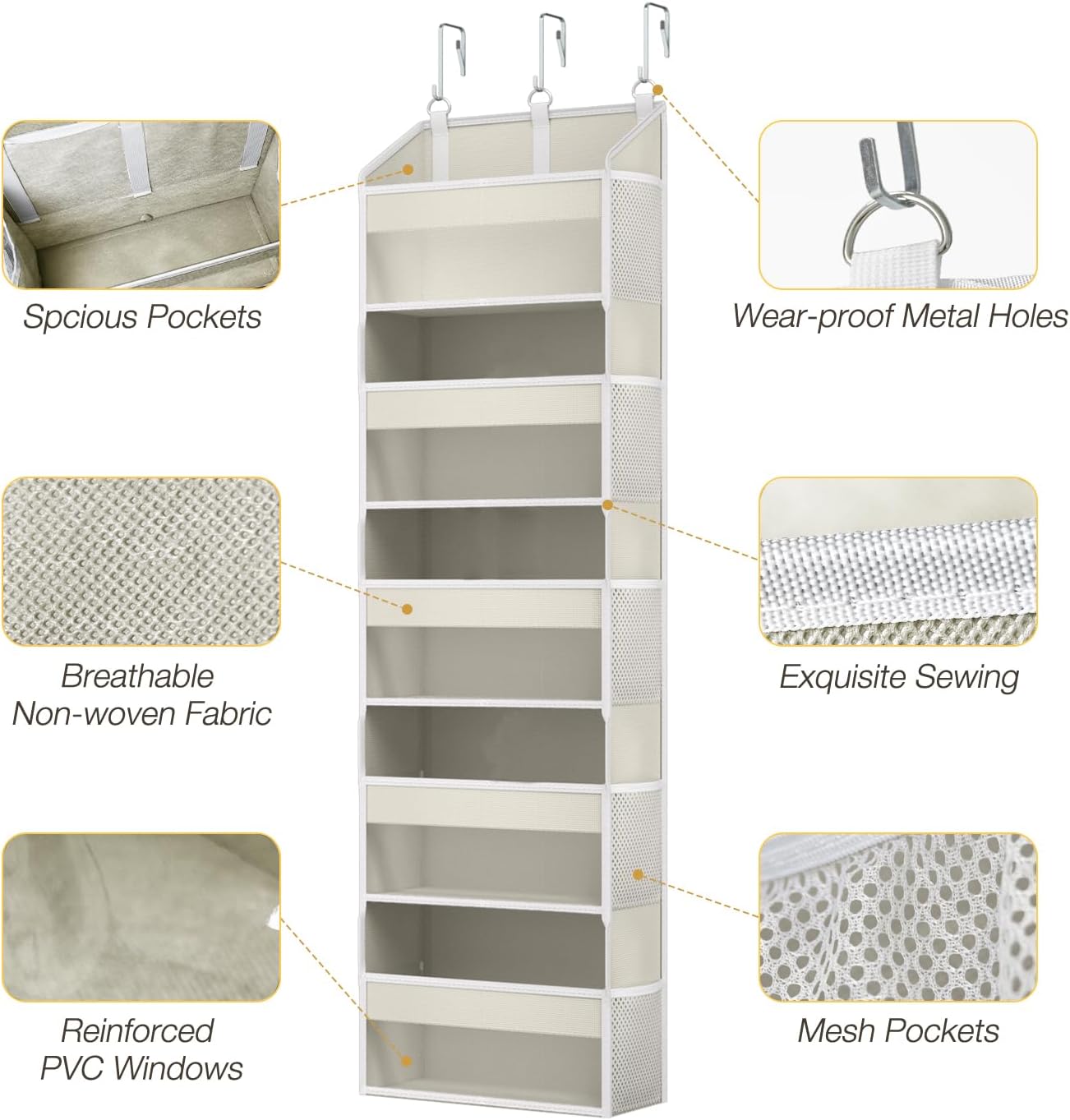 Heavy-Duty Construction & Maximized Storage: Engineered with ultra-thick non-woven fabric, this over door organiser withstands up to 50 lbs (22.6KG) load capacity. The 5 oversized front pockets (14.96″W x 10.23″H) store bulkier essentials like shoes or towels, while reinforced stitching prevents sagging. Color:Beige